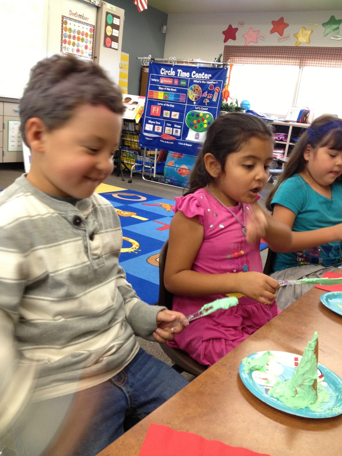 The last week before winter break, we read stories about pine trees, decorated our very own Christmas tree (an edible version), and did some math using ornaments for paper Christmas trees.